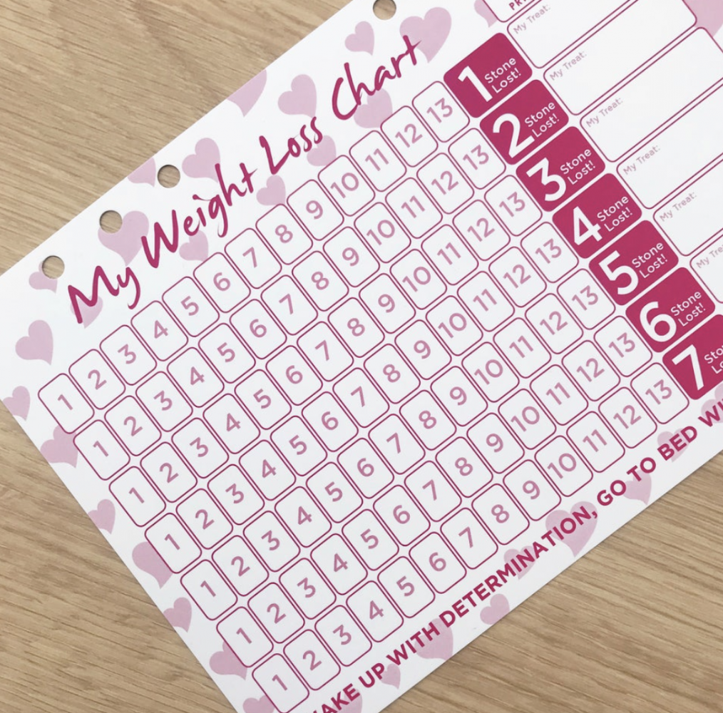 WEIGHT LOSS CHART INSERT WITH STICKERS This product is made with a high quality card, it has a space for you to apply your sticker each pound you lose, at the end on the right hand side in the photo you can see each milestone. Once you have reached that award there is a space for you to place another sticker and an area for you to write what you're treat is going to be for reaching that milestone. This insert is a great visual motivational tool to really keep you aware of how far you are coming with your journey and make you more determined than ever to reach those milestones. A5 in size, 143 tick stickers and already hole punched therefore compatible with the Princess Planning a5 (6 ring) organisers.
