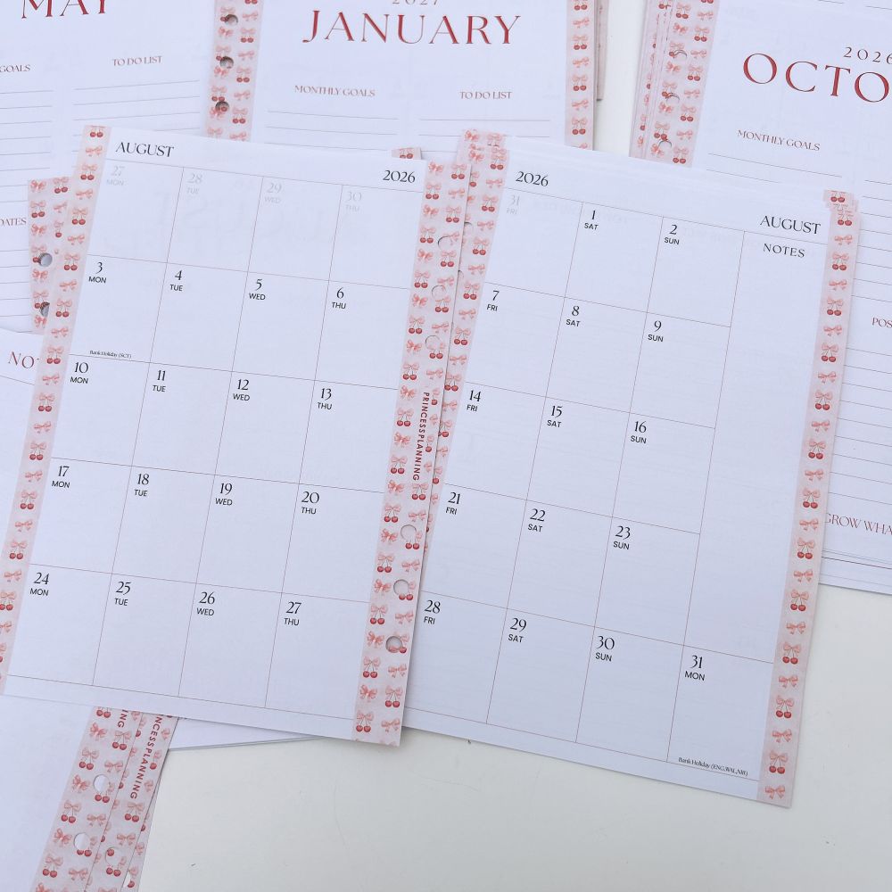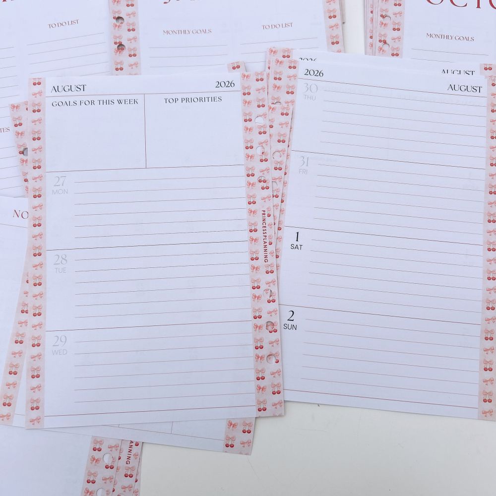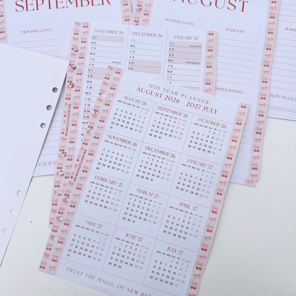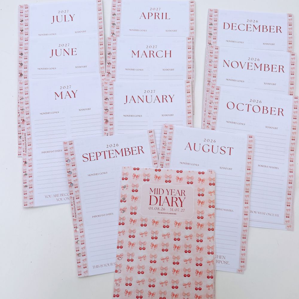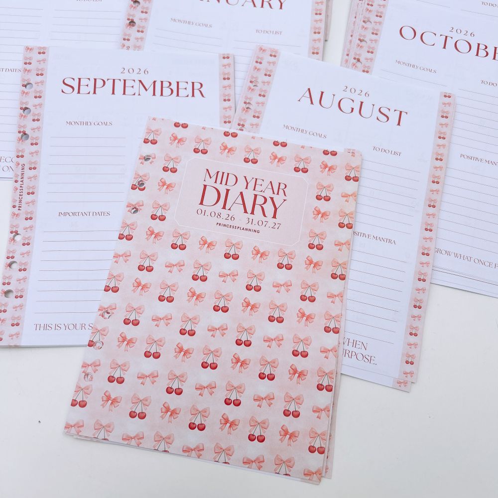 "Mid-year/Academic Dated Diary inserts" are available from August 2026 to July 2027. They are made of premium, high-quality paper and hole-punched to fit into your Grande planners.
